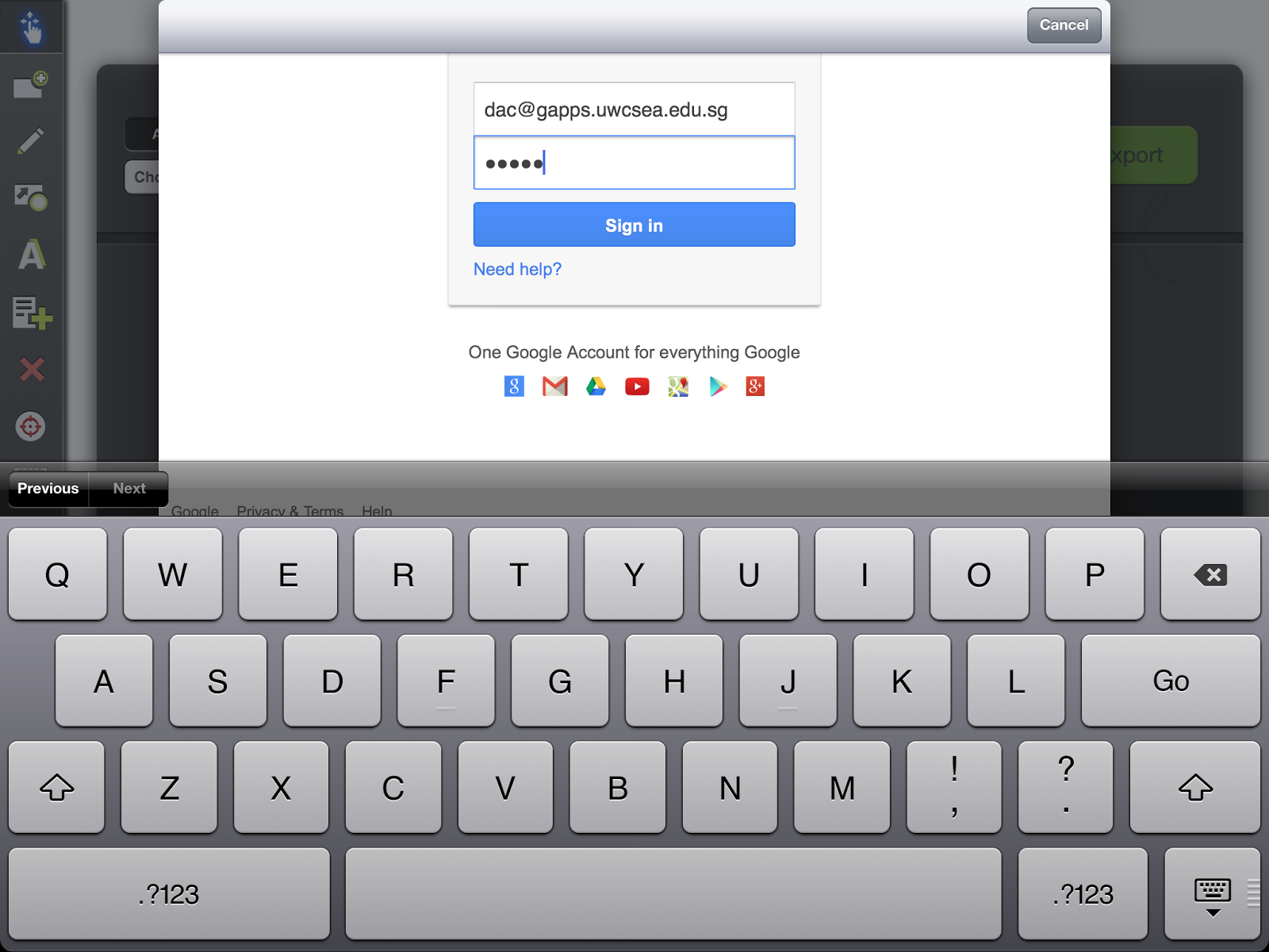 You will be prompted to sign in to Google Drive. **Very important – don’t forget to include the gapps part of your email address. Ex. dac@gapps.uwcsea.edu.sg