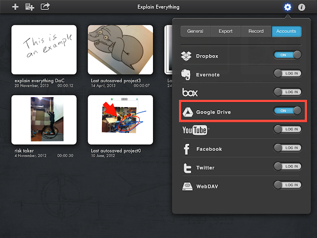Remember that you are still logged into your Google drive account. You will need to log out so other people can’t access your account. To do that, go to the home page of Explain Everything (click on the house in the bottom right corner of the screen) and click on the gear in the top right of the screen. Then click on the Accounts tab and slide the Google Drive switch from “On” to “Log In”.