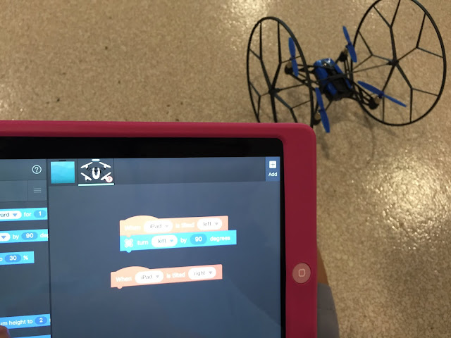 One of our worries is that if one of the students uses the iPad to control the drone in this fashion, it becomes less of a team effort than entering code and seeing if their program works. When students enter a set of commands as a team, it doesn’t matter who presses the button and starts the program running, the device is going to do what the program says. When the program is designed to respond to how the iPad is moved, it becomes more of a one person activity. There is, of course, value in both forms of coding and that is the point. It is great to have a balance and learn how to use both types of coding experience.